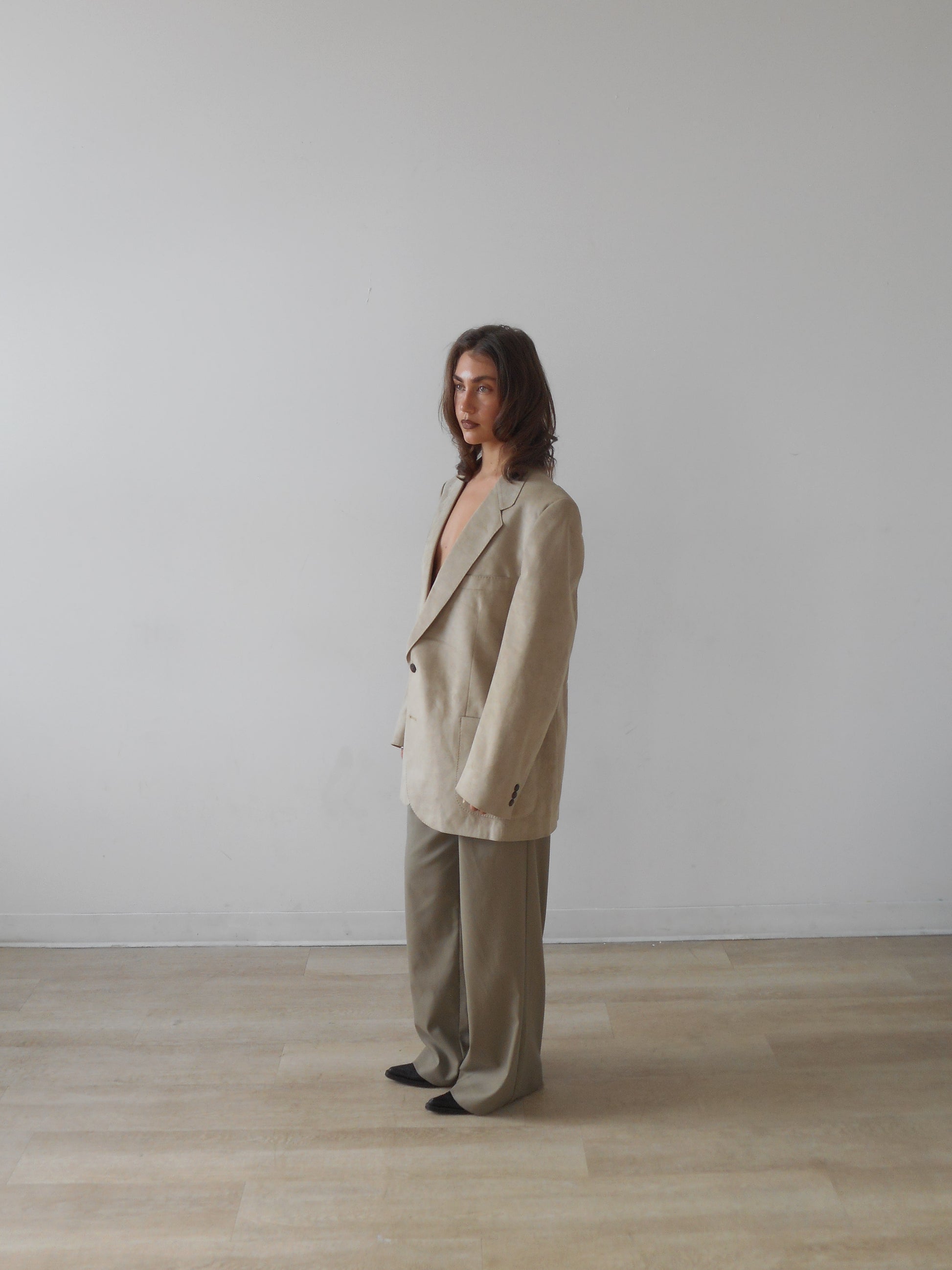 Neutral beige tailored blazer with a modern, minimalist silhouette.